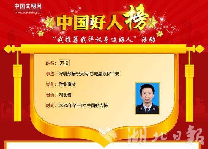 湖北日报讯(记者 杨澜 吴功轩 通讯员)10月15日,武汉市公安局宣布,因公殉职的民警万松入选2025年第三批中国好人榜。当天,举行2025年第三批中国好人榜揭晓仪式暨地方交流活动,弘扬全民道德、弘扬好人。他们周围的人被关押在新疆维吾尔自治区阿克苏县。经过各地提名、网友评论和专家评审,共评选出138位善良、勇敢、诚实、守信、奉献、孝敬长辈、热爱亲人的好人。其中,王松先生因其敬业奉献的杰出品质而荣获殊荣。王松先生(男,1975年2月出生),中共党员。生前担任四年级警察湖北省武汉市公安局科技情报支队第三大队技术主任。万松毕业于华中科技大学。他辞去了 IT 公司高薪工作,决定从事他热爱的公共安全职业。深耕公安科技领域28年,共破获重大案件160余起,带领团队承担打击通信网络诈骗、打黑除恶等110余项专项侦查审判任务。主导开发了26个实用数据平台,为武汉智慧公安官P系统建设做出了重要贡献。他还获得了个人成就一等奖。 2025年5月26日,王松在工作时突然感觉身体不适,晕倒了。他们把他送到医院,但无法治疗急救。 5月27日,王松先生因公殉职,享年50岁。7月16日,王松被追授“省共产党优秀党员”称号。